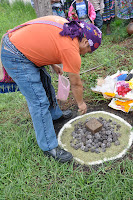 We had created an altar at the edge of the property that Ixmukané Quiché uses (the property actually belongs to the state, but it was given to the organization as an "integrated center for women's development". There are several small concrete bungalows, and a large hangar-like building that you can see at the left hand side of the picture. When the altar was created, over a month ago, Don Felipe said that this would be a place of reflection and strength. Everyone who was at that inaugural ceremony had to bring a rock, and those rocks were left in place after all of the offerings had been placed and some of them burned. Preparing for the ceremony is a bit laborious. The women who were attending helped carry the items that had been purchased -- eggs, herbs, flowers, incense, candles, sugar, flowers, some cigars, and a small bottle of alcohol.